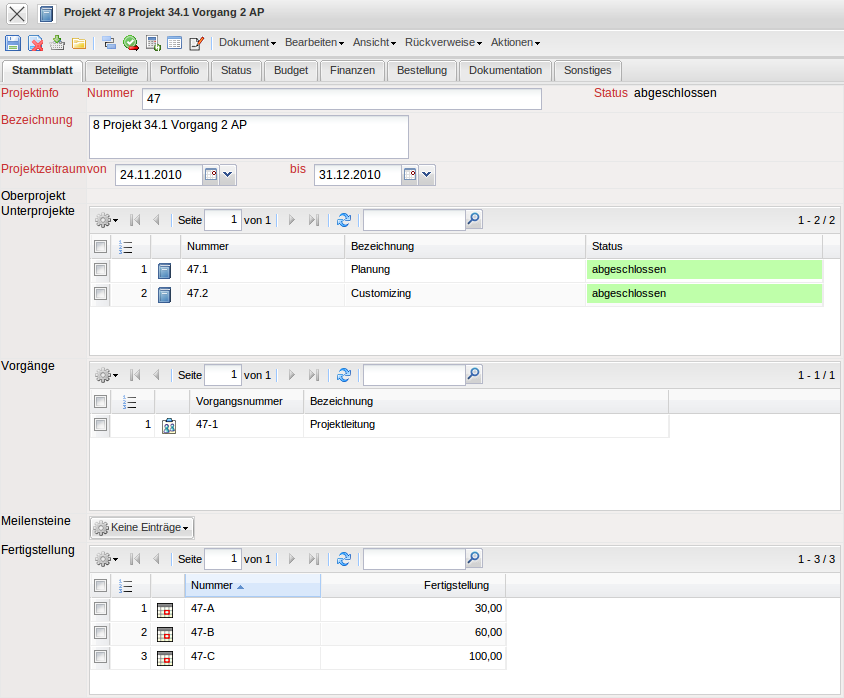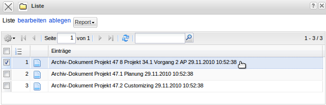 Das System findet drei archivierte Projekte (das Oberprojekt 105 und zwei Teilprojekte des Projektes 105).