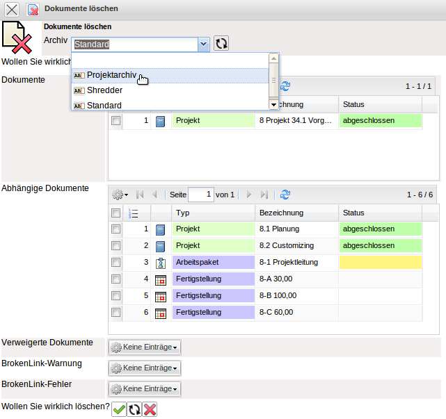Dieser Dialog ist eine Sicherheitsvorkehrung, da der Löschvorgang nur von ausgewählten Benutzern rückgängig gemacht werden kann (siehe auch Papierkorb/Archiv). Wenn das Projekt gelöscht wird kann es wieder aus dem Archiv hergestellt werden. Analog funktioniert auch die Archivierung zur späteren Wiederherstellung von Projekten oder anderen Datenbeständen.