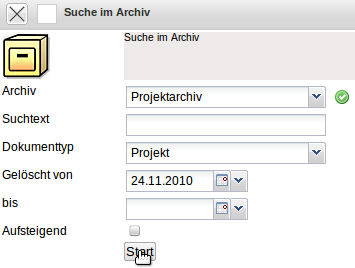 Im Beispiel wird im Projektarchiv nach allen Projekten gesucht, die nach dem 08.01.2007 gelöscht worden sind:
