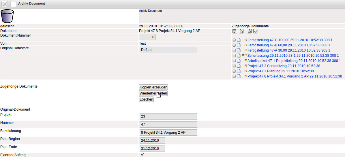 Im gelöschten Dokument befinden sich die Informationen wann das Dokument von welchem Benutzer gelöscht worden ist, sowie der Inhalt des gelöschten Dokumentes. Dieses Dokument kann als Kopie oder im Originalzustand wiederhergestellt werden oder aus dem Projektarchiv gelöscht werden.