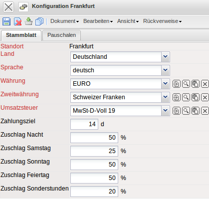 Im Dokumenttyp Konfiguration werden die globalen Parameter für die firmenweiten Einstellungen definiert. Dazu gehören Standort der Projectile-Version, das Land der Firma, die Sprache und die Haus- und Zweitwährung der Firma, die Km-Pauschalen für Dienstfahrten und Reisetätigkeitssätze, Zahlungsziel, Eckwerte für Mahlzeitenstellung (siehe auch Dokumenttyp Reise) und Zuschläge.