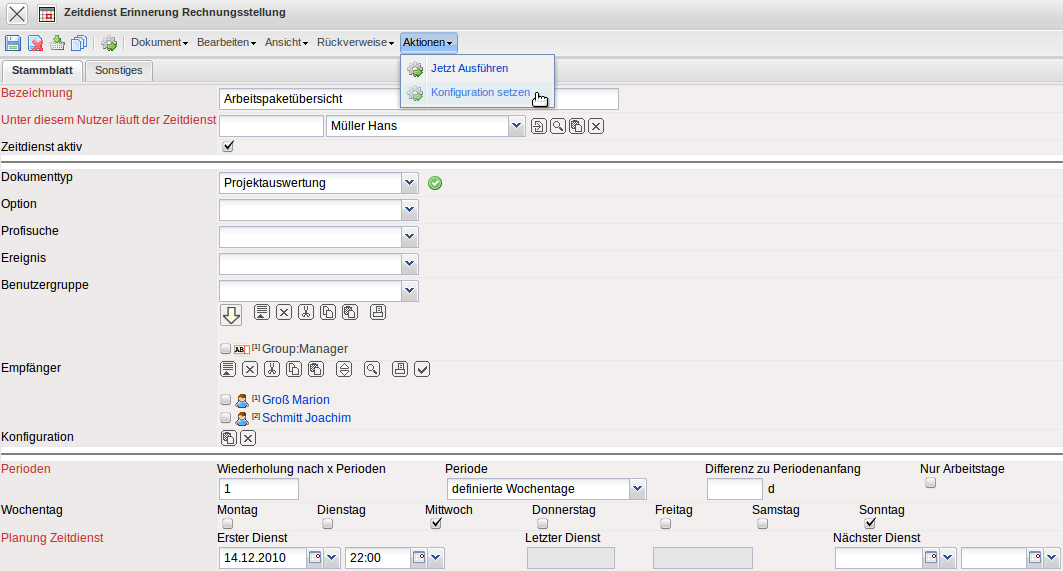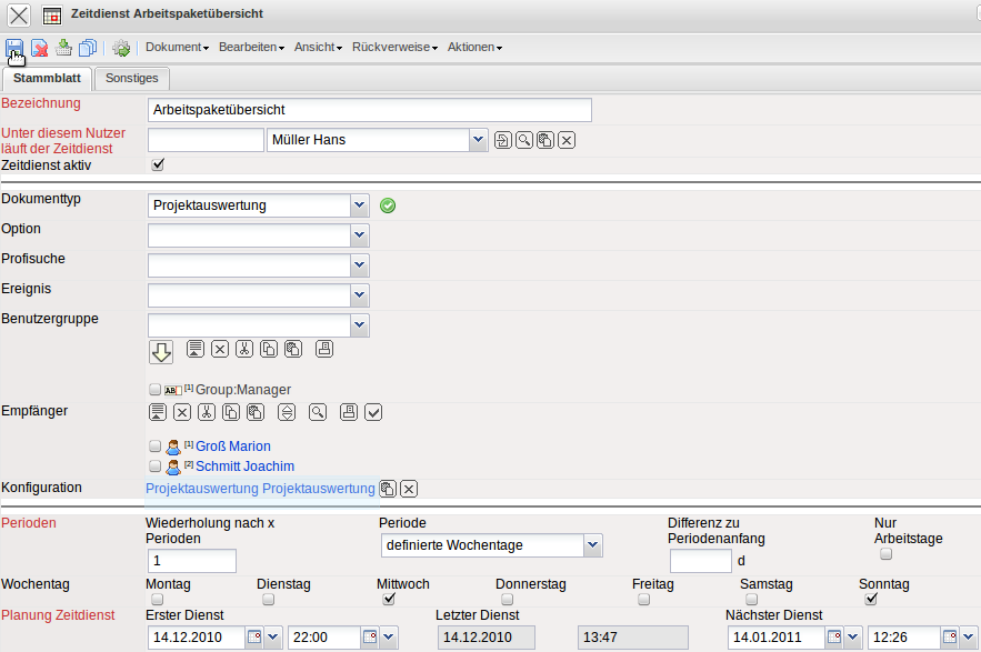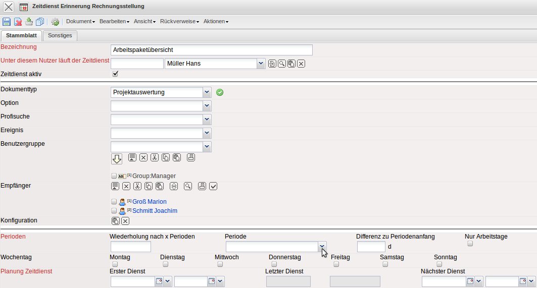 Dann wird das Feld Bezeichnung gefüllt und ein Dokumenttyp (hier die Projektauswertung) ausgewählt. Dann werden die Empfänger des Zeitdienstes bestimmt. Es können sowohl einzelne Mitarbeiter als auch Gruppen (hier alle Benutzer der Gruppe Manager) als Empfänger des Zeitdienstes definiert werden.