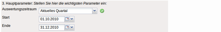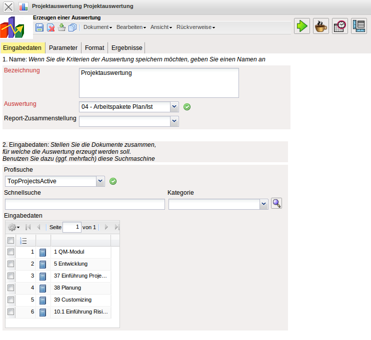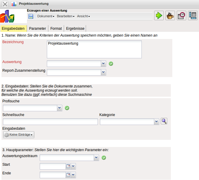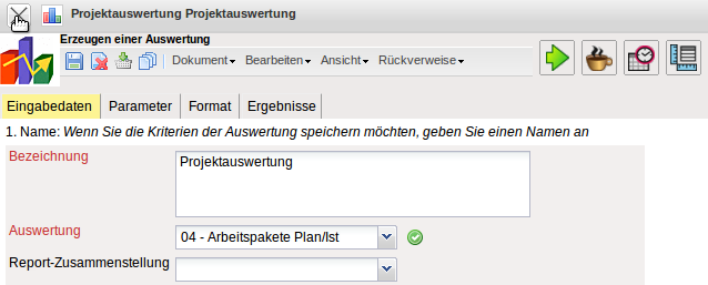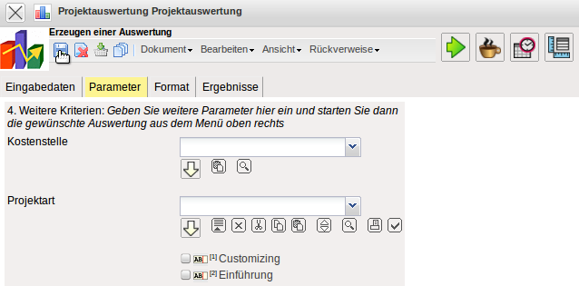 … um die Auswertung zu konfigurieren. Es öffnet sich die Projektauswertung und hier können jetzt die Selektionskriterien definiert werden (siehe auch Abschnitt 2.5).