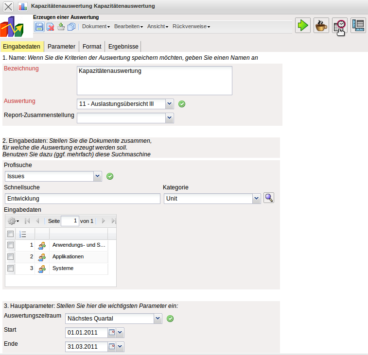 Im folgenden Beispiel wird eine Kapazitätsauswertung automatisiert. Zunächst wird die Auswertung geöffnet und die Selektionskriterien gefüllt. Im Beispiel soll für alle Mitarbeiter der Units Entwicklung, Systeme und Applikationen eine Kapazitätsauswertung für das nächste Quartal erstellt werden. Mit Hilfe der Funktion “Zeitdienst” …