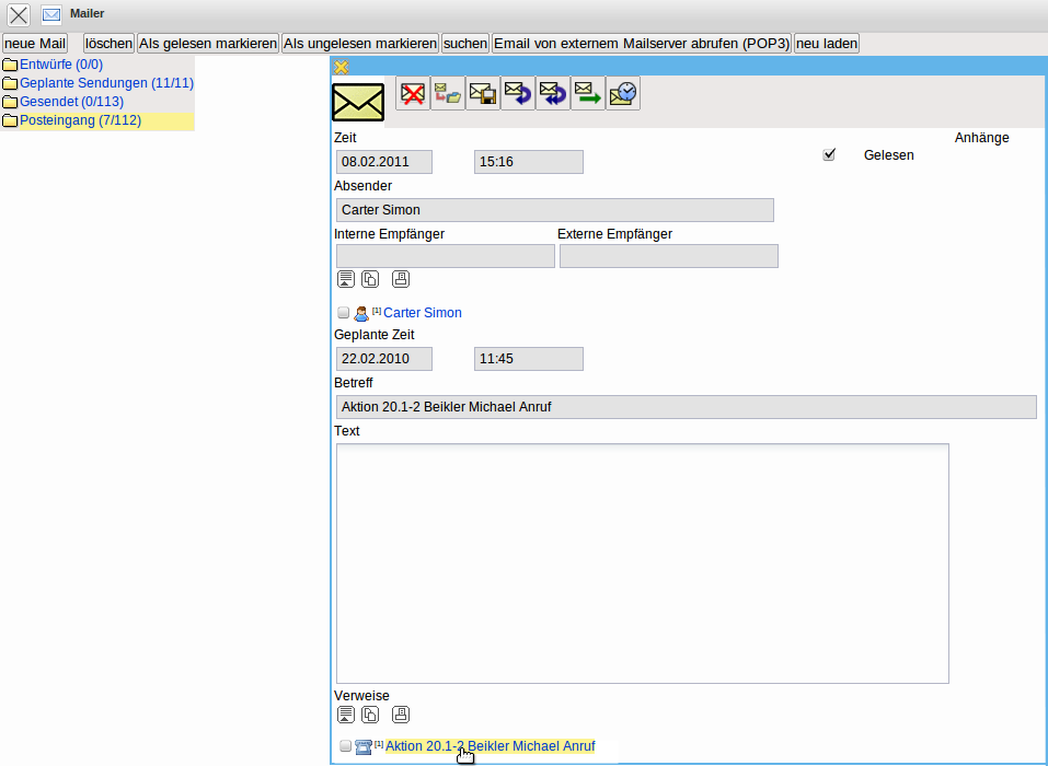 Wird die optionale Komponente Mailer verwendet, erzeugt das System am Tag der Wiedervorlage automatisch eine Benachrichtigung für diese Aktion …