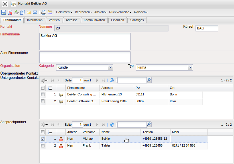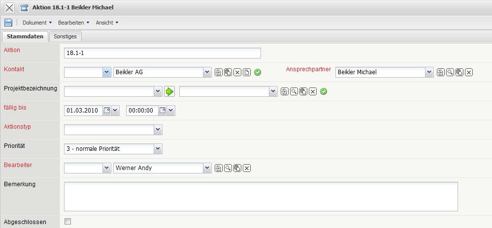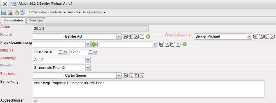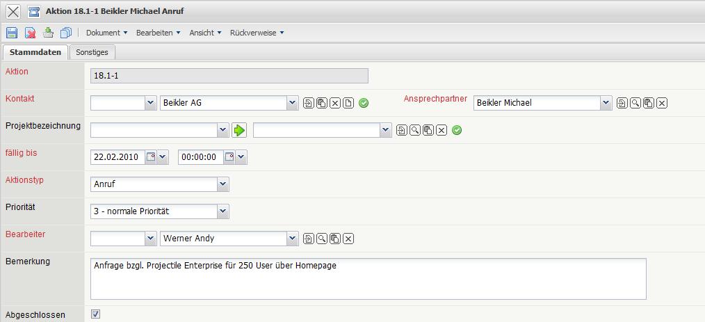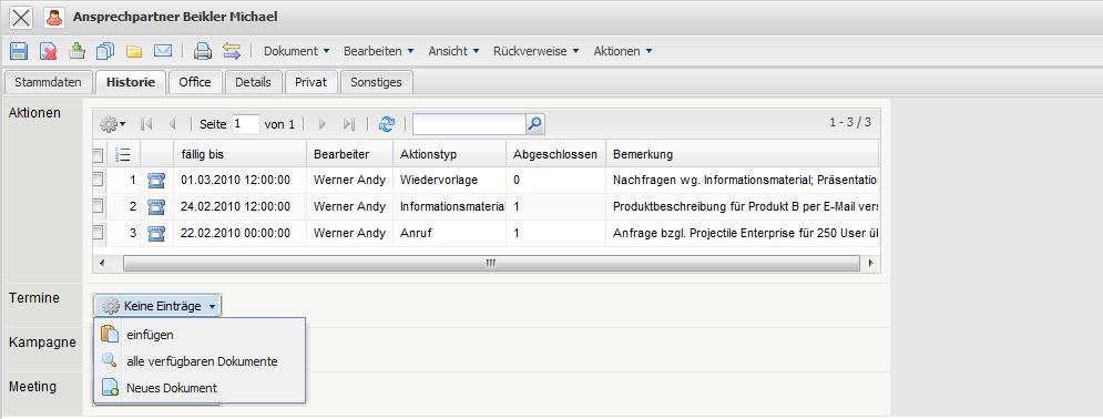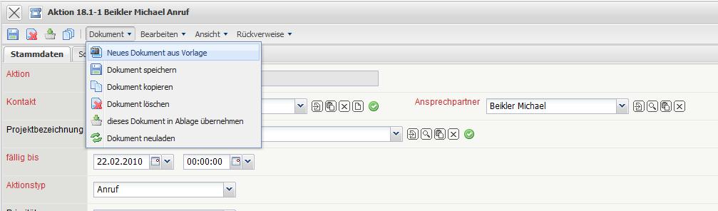 Das System erzeugt ein neues Dokument vom Typ “Aktion” und belegt den Ansprechpartner und einige andere Werte automatisch vor.