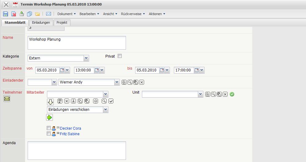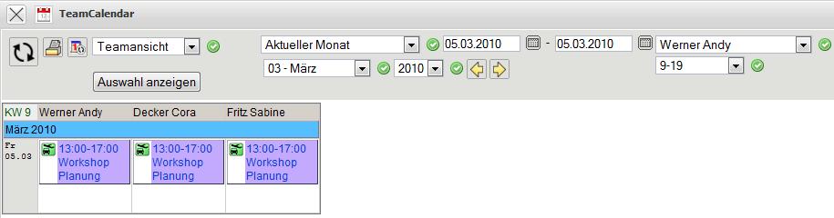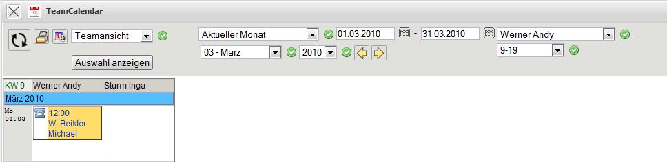 Wenn die optionale Komponente TeamCalendar verwendet wird, erscheint diese Aktion auch im Gruppenterminplaner (hier als Termin von Andy Werner am 01.03.2010) und kann von hier geöffnet werden.