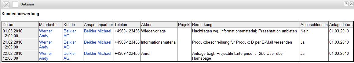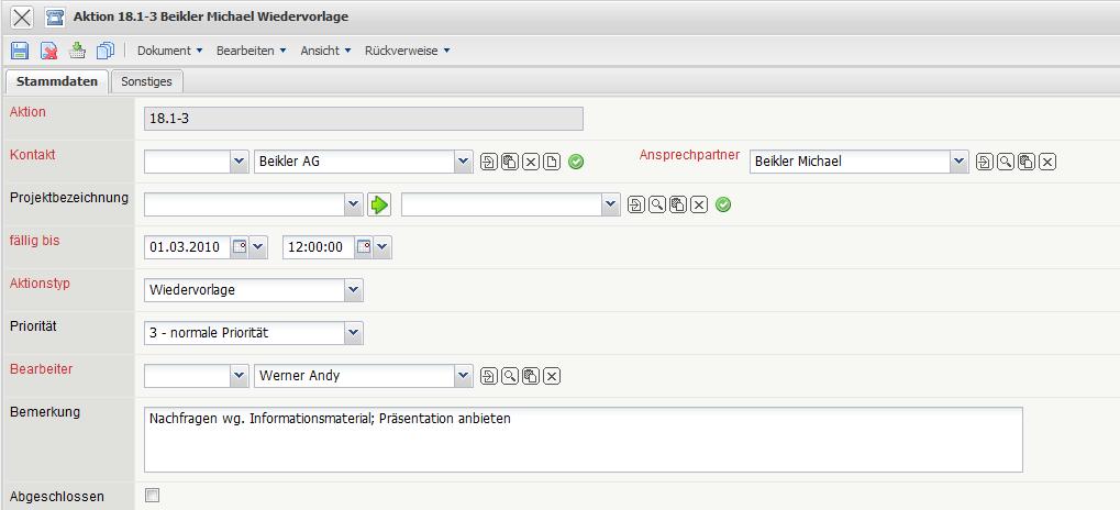 Die zweite Aktion ist hier das Versenden von Informationsmaterial auf die Anfrage. Auch diese Aktion wird als Abgeschlossen markiert. Die Check-Box “Abgeschlossen” kennzeichnet eine erledigte Aktion. Ist dieses Kennzeichen nicht gesetzt, handelt es sich bei der definierten Aktion um eine Wiedervorlage, die entsprechend in der Kontaktauswertung angezeigt werden kann.