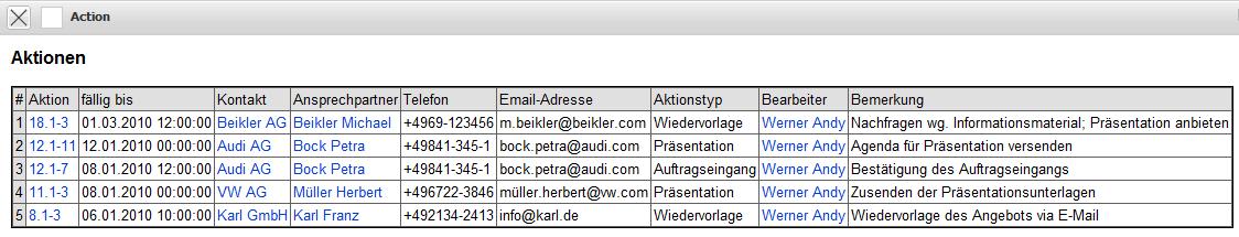Für jeden Ansprechpartner können beliebig viele Aktionen definiert werden. Aktionen können beispielsweise Anfragen, Terminabsprachen, Wiedervorlagen oder ähnliches sein. Diese Aktionen protokollieren wichtige Ereignisse mit (Historie) und können darüber hinaus für die Akquise und Kundenpflege verwendet werden.