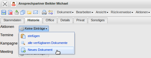 Diese Aktionen werden mit Hilfe der Funktion “Neues Dokument” in dem Dokumenttyp “Ansprechpartner” definiert: