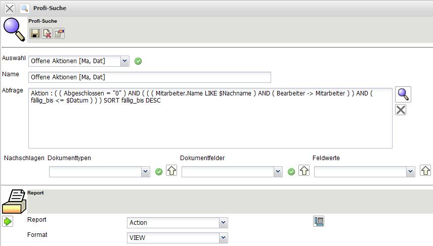 Im Beispiel wird die Abfrage “Offene Aktionen [Ma, Dat]” verwendet. Diese Abfrage listet nach einigen Eingaben …