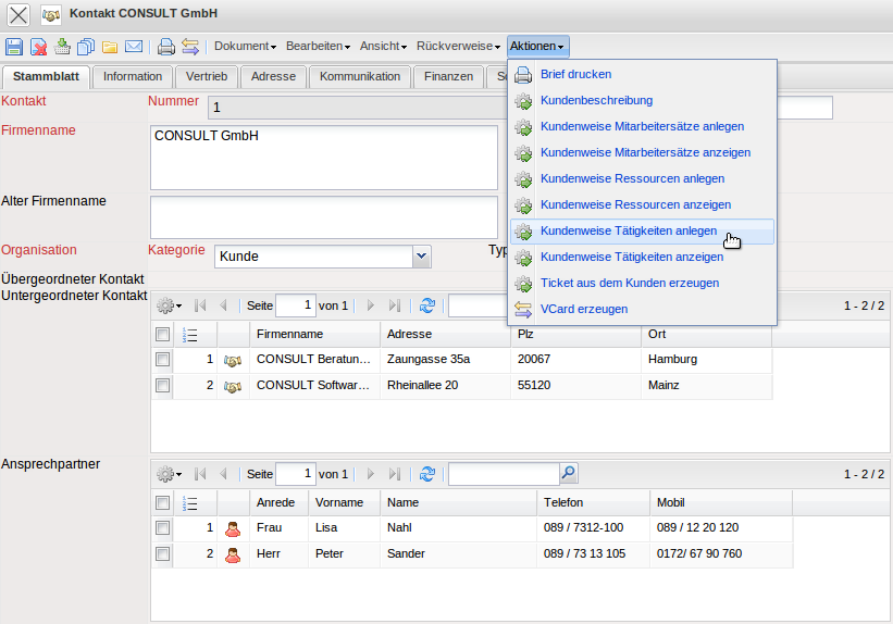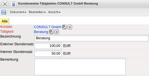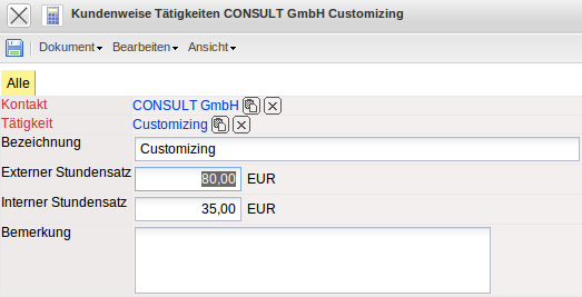 Die Kundenweisen Tätigkeiten ermöglichen die Definition von kundenbezogenen Berechnungssätzen auf Basis der Tätigkeiten. Die Verrechnungssätze der kundenbezogenen Tätigkeiten werden direkt aus dem Kontakt (Kunden) heraus definiert.