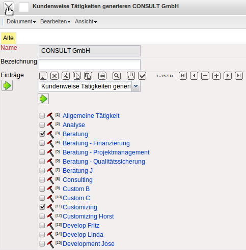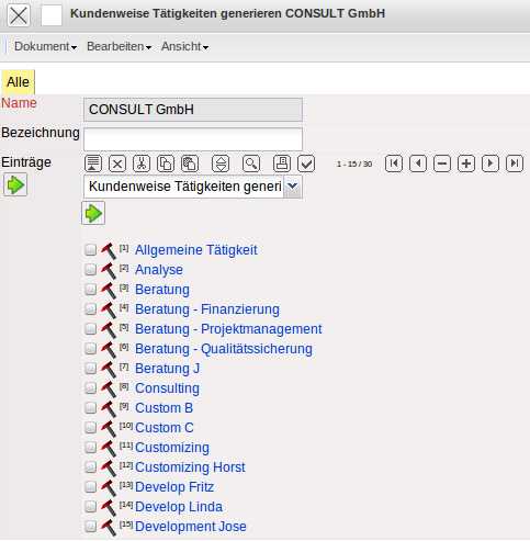 …es öffnet sich eine Übersicht über alle Tätigkeiten. Hier können nun die Einträge markiert werden, die für diesen Kunden explizit angepaßt werden sollen.