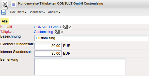 In diesem Beispiel bezieht sich dies auf die Tätigkeit Customizing für den Kunden CONSULT GmbH. Für jedes Projekt für diesen Kunden wird nun (wenn dem Arbeitspaket die Tätigkeit Customizing zugeordnet ist) der Satz von EUR 80,00 pro Stunde angeboten und berechnet.