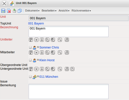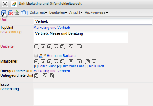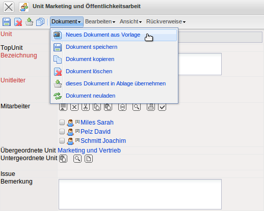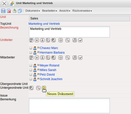 Es besteht die Möglichkeit für diese Unit “Sales”, untergeordnete Units anzulegen. Dazu klickt man auf den Menüpunkt “Neues Dokument” in der Zeile Untergeordnete Unit.