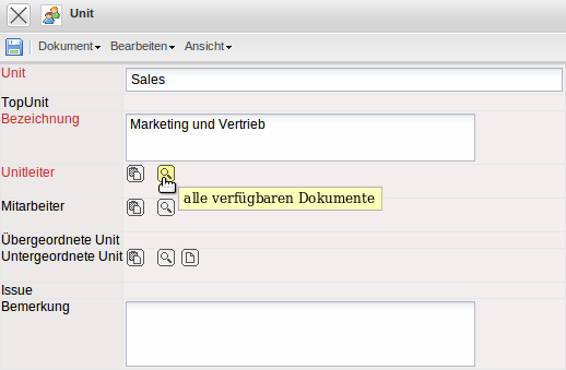 Im folgenden Beispiel wird eine neue Unit “Sales” mit zwei untergeordneten Units definiert. Für die Definition der Unitleiter wird mit Hilfe der Funktionalität “alle verfügbaren Dokumente” eine …