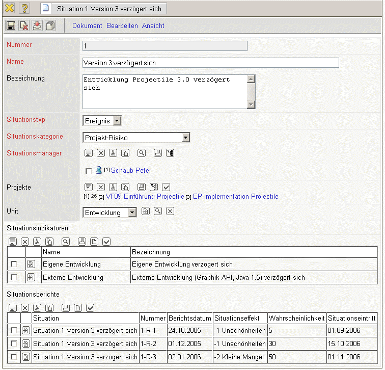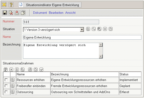 Das optionale Modul Risikomanagement (Situationsmanagement) ermöglicht die Erfassung von Indikatoren und Maßnahmen sowie die Zusammenfassung der Indikatoren zu Risiken (Situationen).