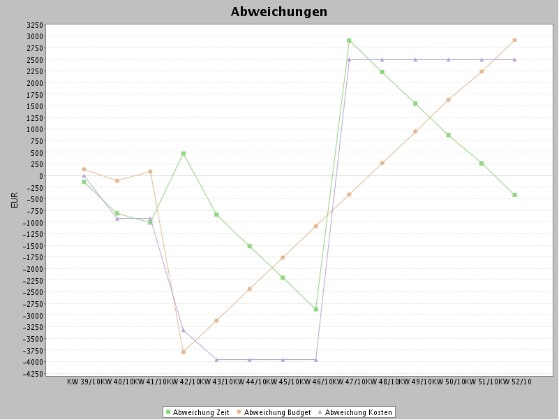 Die zweite Graphik der Auswertung visualisiert die Abweichungen Zeit BCWP - BCWS, Budget BCWS - ACWP und Kosten BCWP - ACWP .