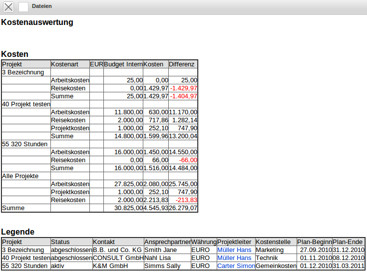 Diese Auswertung erzeugt eine Übersicht über alle geplanten, beauftragten, erbrachten, fakturierbaren und bereits fakturierten Projektleistungen auf Basis der erfassten und abgerechneten Zeiten und Kosten. Diese Auswertung basiert auf den Projekten.