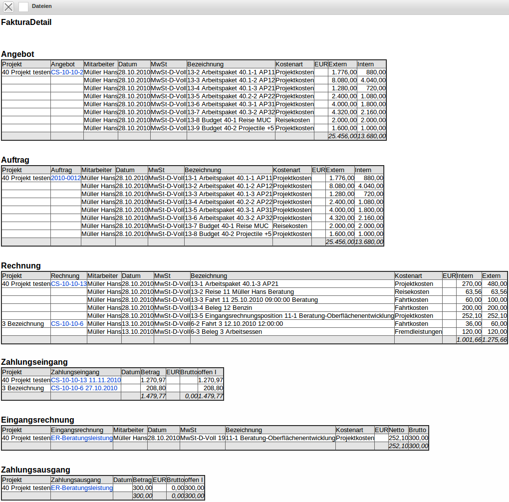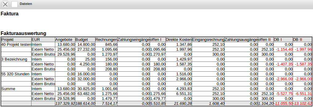 Fakturadaten: Hier werden die Angebotswerte (Extern Netto/Extern Brutto) und der interne Angebotswert (Angebot basiert auf diesen internen Kosten), die internen und externen Budgets (aus den Arbeitspaketen und der Budgetverwaltung), die Rechnungsbeträge (Extern Netto/Extern Brutto) und der interne Rechnungswert (fakturierbare Leistungen) sowie die Zahlungseingänge und offene Forderungen aufgelistet.