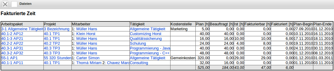 Die Auswertung Fakturierte Zeit erzeugt eine detaillierte Übersicht über alle geplanten, beauftragten, erbrachten, fakturierbaren und bereits fakturierten Projektleistungen auf Basis der erfassten und abgerechneten Zeiten. Diese Auswertung basiert auf den Arbeitspaketen und bestimmt die Planzeiten direkt aus den Aufgaben, die Ist-Zeiten aus der Leistungserfassung (TimeTracker) und die fakturierten Zeiten aus den Rechnungsdaten.