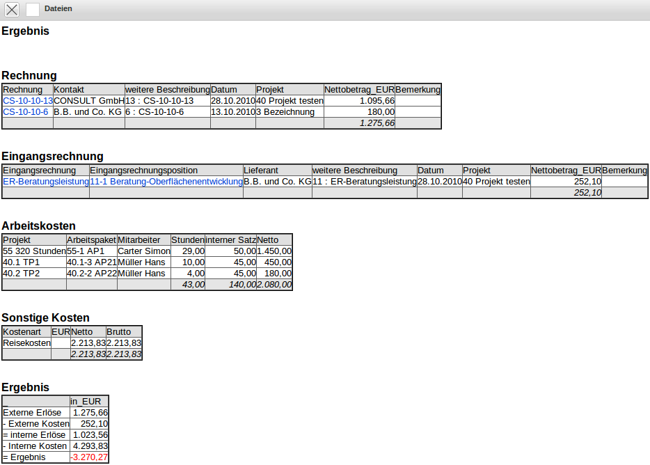 Kostendaten: Hier werden aus der Zeit- und Kostenerfassung die direkten Kosten (Reisekosten, Fahrtkosten, Belegkosten und Fremdkosten) und die Fremdrechnungen inklusive Zahlungsausgänge und evtl. die offenen Verbindlichkeiten aufgeführt.