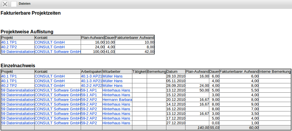 Die Auswertung Fakturierbare Projektzeiten erzeugt eine detaillierte Übersicht über alle erfassten und fakturierbaren Zeiten. Die Istaufwände kommen dabei direkt aus dem TimeTracker, die Werte für die fakturierbaren Dauern entweder aus dem TimeTracker (wenn die entsprechende Option aktiv ist) oder aus der Funktionalität “Fakturierbare Zeiten”. Diese Variante listet die Projektzeiten projektweise auf und führt im unteren Teil die Einzelzeitnachweise mit den Bemerkungen auf.
