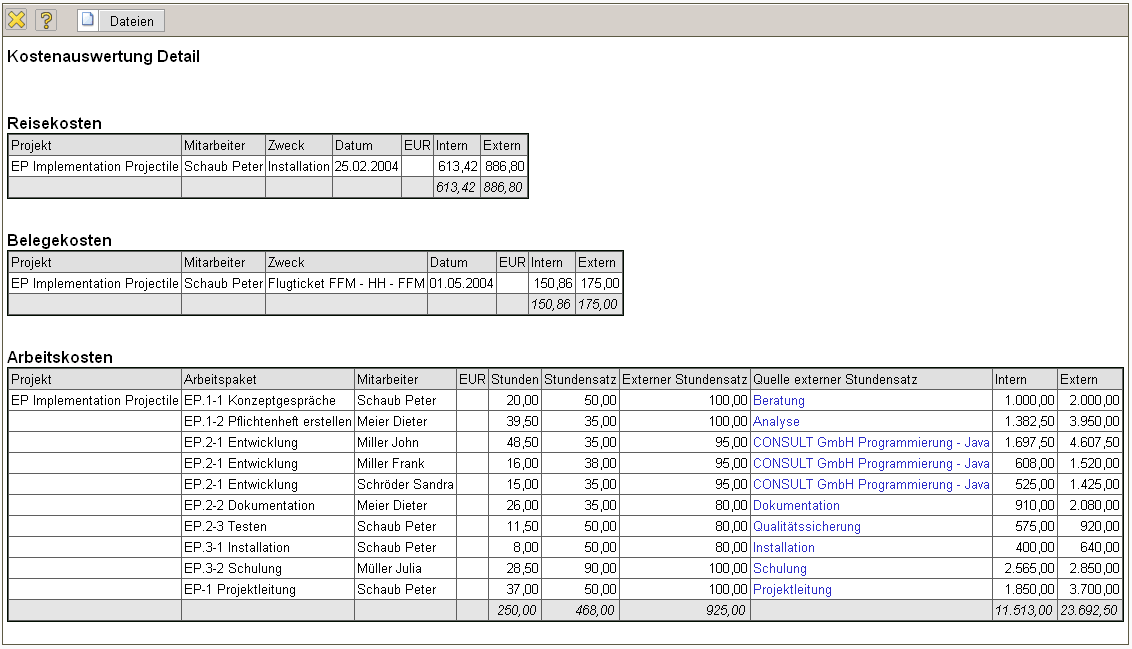 Die Auswertung Kostenauswertung Detail liefert eine detaillierte Kostenübersicht über die ausgewählten Selektionskriterien. Hier können die Reisekosten, Fahrtkosten, Belegkosten, Fremdkosten, Fremdrechnungen und Arbeitskosten (auf Basis der Arbeitspakete) im Detail aufgelistet werden. Bei den sonstigen Kosten werden Netto-Beträge angezeigt und bei den Arbeitskosten werden die internen Stundensätze der Mitarbeiter zur Bestimmung der Arbeitskosten herangezogen werden.