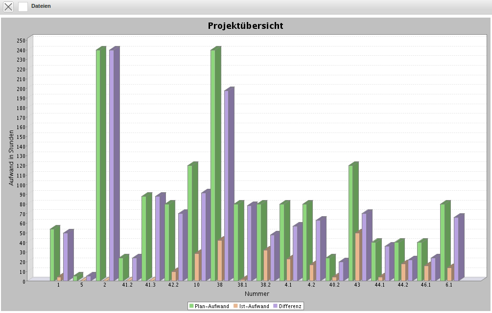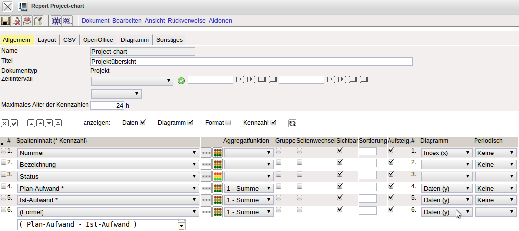 In der Spalte Diagramm müssen für eine 2-dimensionale Auswertung mit x- und y-Achse die Achsen bestimmt werden. Mit Index (x) wird die x-Achse (waagerecht) bestimmt und mit Daten (y) werden die Werte für die y-Achse (senkrecht) gekennzeichnet. Im Beispiel sollen für die Projekte (Nummer) die Werte Plan-Aufwand, Ist-Aufwand und die Differenz (Formel) abgetragen werden.