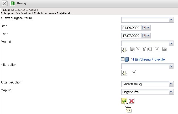 … öffnet sich ein Dialog. Hier werden der Leistungszeitraum, die Projekte und/oder Mitarbeiter die Anzeigeoption (Zeitschnipsel oder Arbeitspaket) und eine Prüfoption ausgewählt. Im folgenden Beispiel wird für den Zeitraum 01.02.2011 bis zum 28.02.2011 für das Projekt 1 Einführung Projectile jede einzelne ungeprüfte Zeiterfassung angezeigt.