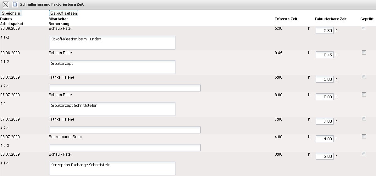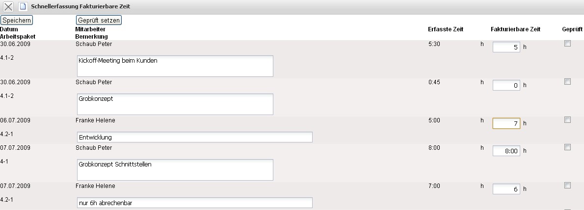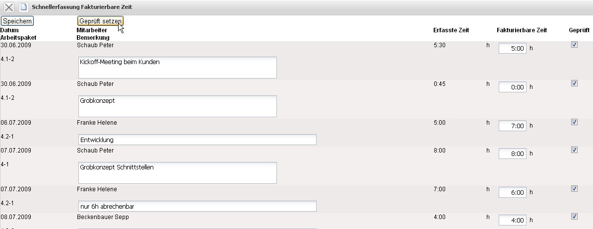 Bereits bearbeitete Zeiteinträge können auf “Geprüft” gesetzt werden. Nach dem Abspeichern werden bei der Rechnungsstellung die fakturierbaren Leistungen zur Weiterbearbeitung verwendet.
