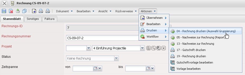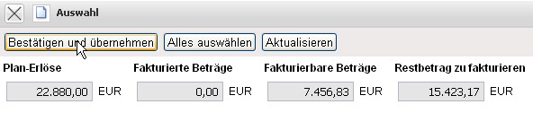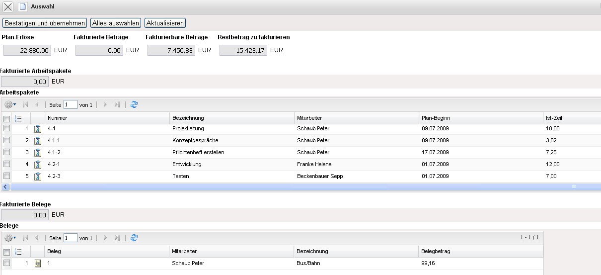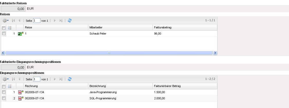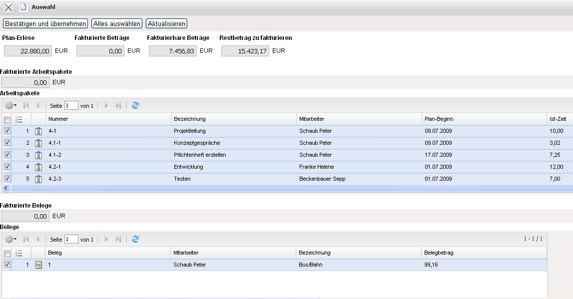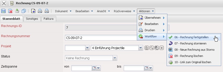 Die Rechnung erhält nun den Status Rechnung fakturiert und wird inklusive aller Positionen für Manipulationen gesperrt. Alle Positionen, die auf sonstigen Kosten basieren, werden im System als fakturiert gekennzeichnet. Bei den Arbeitspaketen wird die abgerechnete Dauer übertragen, damit die Arbeitspakete ggf. mehrmals für Teilrechnungen abgerechnet werden können. Bei Einsatz einer Schnittstelle zur Finanzbuchhaltung, werden nach Ausführung der Aktion auch ggf. Buchungssätze erzeugt …