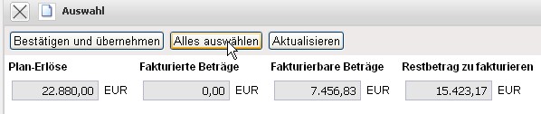 … werden alle abrechenbaren Leistungen angezeigt. Durch Aktivierung der Aktion “Alle Aufwände übernehmen” …