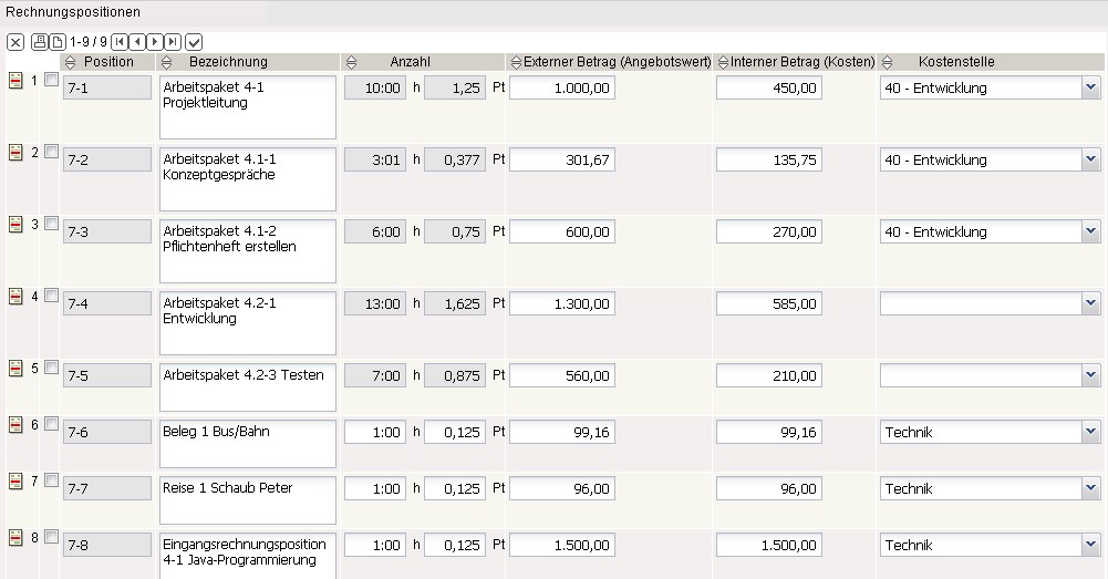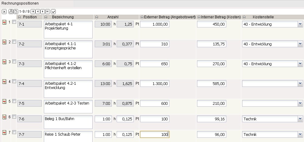 Die so erzeugten Rechnungspositionen können manuell geändert bzw. angepasst werden, in dem man das Feld Anzahl der Positionen oder den Betrag Extern ändert. Der zugehörige Stundensatz des betreffenden Arbeitspaketes ist im System bekannt und die Summe wird automatisch aktualisiert.