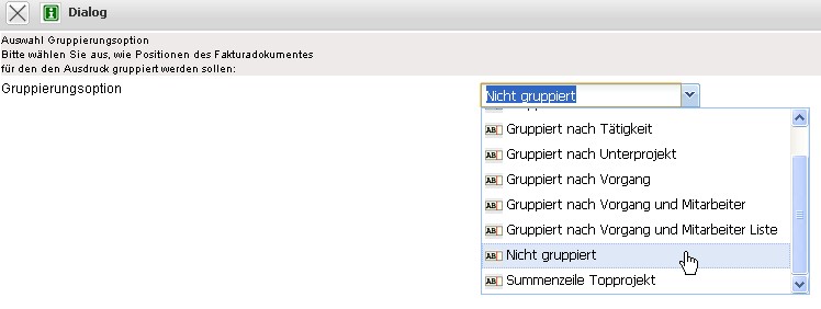 Hier kann zwischen Ausdruck auf Arbeitspaketebene, gruppiert nach Mitarbeiter, gruppiert nach Teilprojekten (1. Ebene anzeigen), gruppiert nach Tätigkeiten oder als eine Zeile mit Gesamtsumme auf Projektebene gewählt werden.