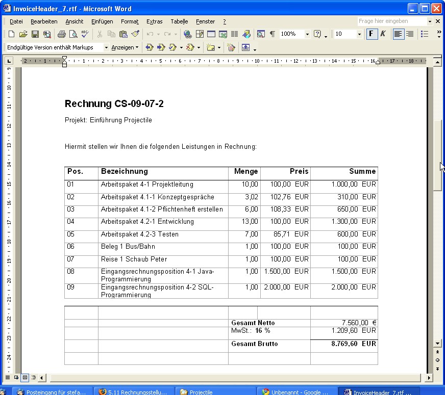 … die ausgewählten Arbeitspakete und Kosten als Rechnungspositionen in die Rechnung generiert. Im Beispiel unten werden fünf Arbeitspakete und mehrere Kostenbelege (eine Fahrt, ein Beleg, eine Reise, die Fremdkosten und eine Eingangsrechnungsposition) als Positionen in die Rechnung übernommen.