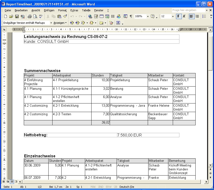 Der Nachweis zur Rechnung basiert auf den fakturierbaren Leistungen und wird in Form eines Reports …