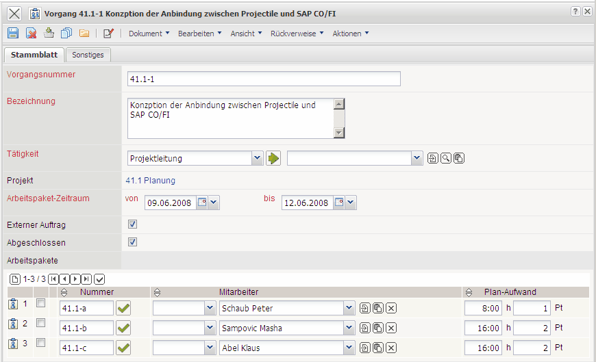 Der Dokumenttyp Vorgang verwaltet die Aufgaben der Projekte. In Projectile sind Vorgänge die Zusammenfassung von Arbeitspaketen. Dieser Dokumenttyp zeigt die Tätigkeit, den Zeitraum und die Aufwände (Plan, Ist, Rest, fakturierbar, fakturiert) an.