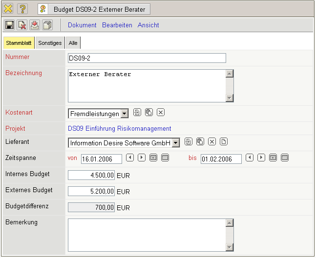 • Das interne Budget wird als Vorgabe für die internen Projektkosten aufgefasst und bei der ButtomUp-Projektplanung als interne sonstige Kosten in die Projektdefinition überführt (siehe Projekte). Dieser Wert bezieht sich auf den Projektzeitraum.