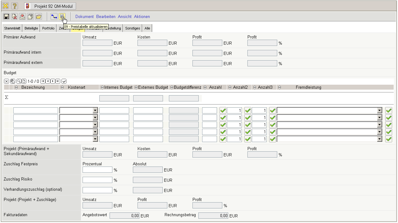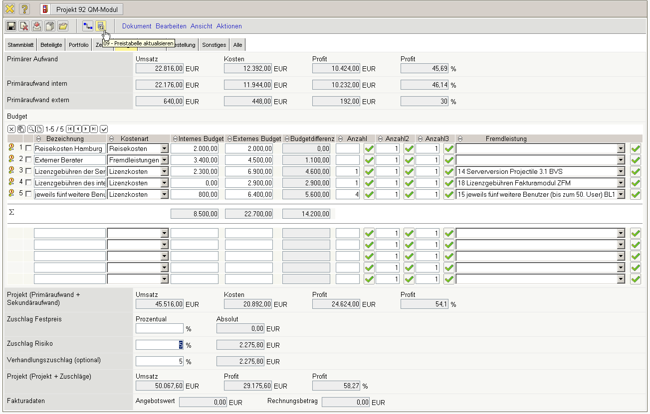 Im Reiter “Budget” können mit Hilfe der Aktion “Preistabelle aktualisieren” …