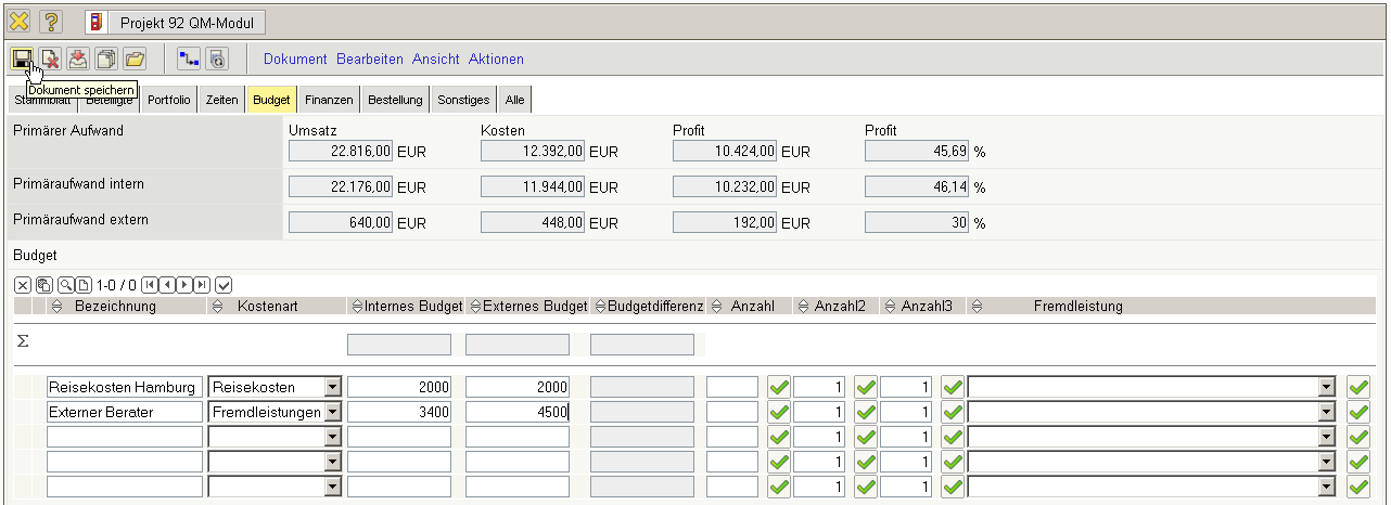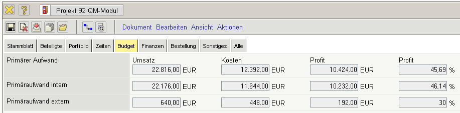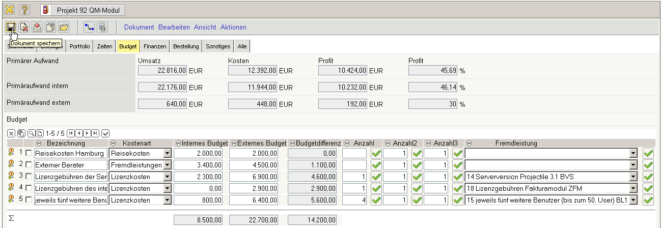 … abgespeichert. Im Beispiel ist ein internes Budget in Höhe von EUR 8.500,00 und ein geplanter Angebotswert von EUR 22.700,00 definiert worden.