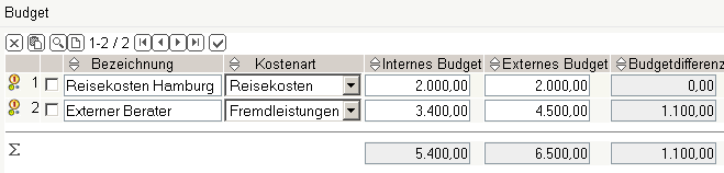 In der Budgetverwaltung können die sonstigen Budgets verwaltet werden. Im Beispiel werden zwei Budgets für Reisekosten und Externe Berater definiert. Die Reisekosten für das Projekt betragen vermutlich EUR 2.000,00 die komplett an den Kunden weiterbelastet werden sollen. Für externe Berater werden EUR 3.400,00 budgetiert und als Angebotswert für diesen Budgetposten werden EUR 4.500,00 geplant.