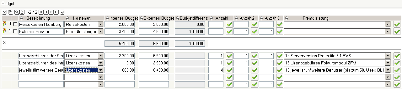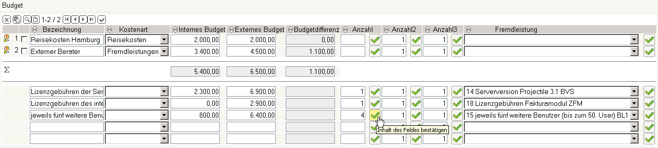 Anschließend werden drei weitere Budgets auf Basis der Artikelverwaltung definiert (1 * Serverversion, 1 * Fakturamodul und 4 * 5 zusätzliche User). Aus der Artikelverwaltung werden die Einkaufs- und Verkaufspreise in die Budgetverwaltung übernommen.