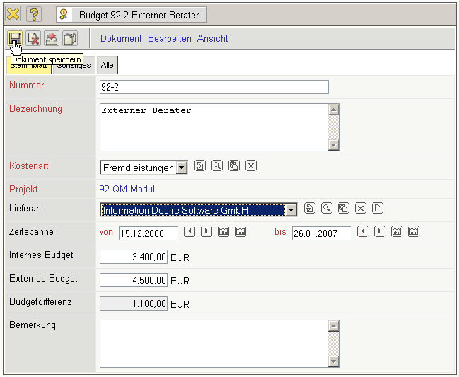 • Das externe Budget wird als Vorgabe für die Rechnungsstellung herangezogen und bei der ButtomUp-Projektplanung als externe Soll-Kosten in die Projektdefinition überführt (siehe Projekte). Dieser Wert bezieht sich auf den Projektzeitraum.