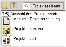 Um ein neues Projekt zu definieren wird zunächst die Funktionalität “Neues Projekt” verwendet. Anschließend öffnet sich ein Dialog mit der Auswahlmöglichkeit Manuelle Projekterzeugung und Projektschablone. Falls eine (oder mehrere) Importschnittstelle vorhanden ist (sind), wird auch die Möglichkeit des Imports von Projekten angeboten.