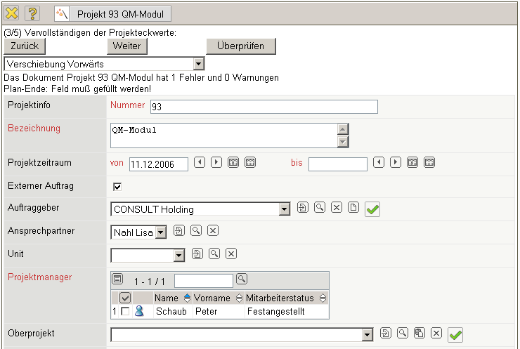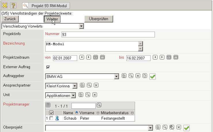 Nach der Änderung der Projekteckwerte kann als Option für den nächsten Schritt ausgewählt werden, ob und wie eine Verschiebung der Start- und Endtermine gewünscht ist. Nach Eingabe aller nötigen Werte, kann mit dem nächsten Schritt (Aktion “Weiter”) fortgefahren werden.
