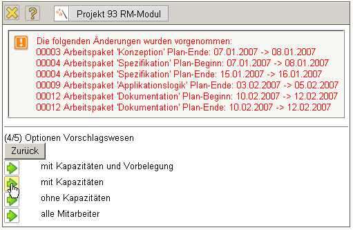 Die Option “mit Kapazitäten und Vorbelegung” zeigt für die Arbeitspakete im nächsten Dialogschritt alle Mitarbeiter an, die den geforderten Skill (Tätigkeit) erfüllen und belegt als Vorauswahl den Mitarbeiter mit der geringsten Auslastung im geplanten Zeitraum vor. Die Option “mit Kapazitäten” zeigt alle Mitarbeiter mit geeignetem Skill und deren Auslastung im Abarbeitungszeitraum an. Die Option “ohne Kapazitäten” berücksichtigt nur das Skillmanagement und ignoriert die Auslastung und die vierte Option “alle Mitarbeiter” ignoriert darüber hinaus auch das Skillmanagement.