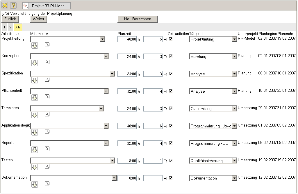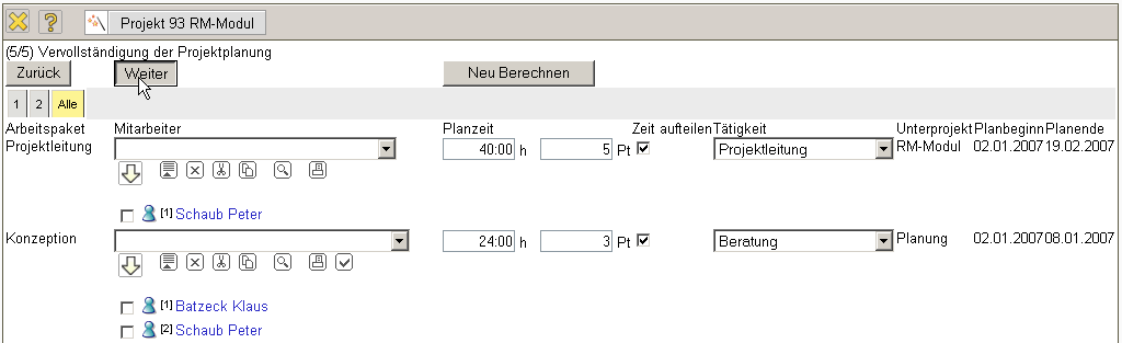 Auf diese Weise werden für jedes Arbeitspaket zwischen 0 und n Mitarbeiter eingeplant (es können auch Arbeitspakete der Schablone nicht besetzt werden; dann erscheint ein entsprechender Hinweis beim Generieren und das Arbeitspaket wird ggf. nicht erzeugt).