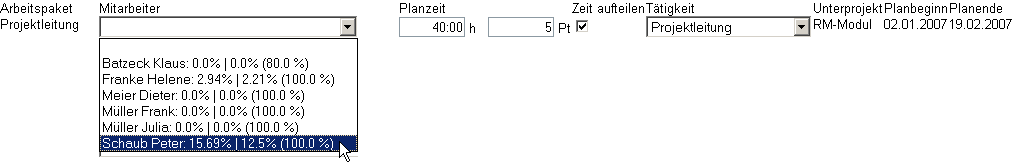 In dem Dialog erscheinen für jedes Arbeitspaket alle Mitarbeiter, die für diese Aufgabe geeignet sind (laut Skillmanagement) und mit den jeweiligen Prozentzahlen ihrer Auslastung. Der Mitarbeiter Peter Schaub kann für die Aufgabe Projektleitung zu 100% verplant werden (Wert in der Klammer) und ist derzeit für den geplanten Abarbeitungszeitraum zwischen dem 02.01.2007 und dem 19.02.2007 vermutlich zwischen 12,50% und 15,69% ausgelastet.