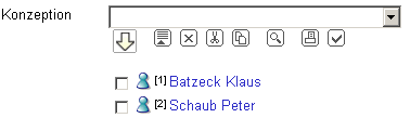 Nach Auswahl des Mitarbeiters, muss dieser (falls Java-Skript nicht verwendet wird) mit Mausklick auf das grüne Häkchen übernommen werden. Dieser Mechanismus kann auch mehrfach hintereinander angewendet werden: